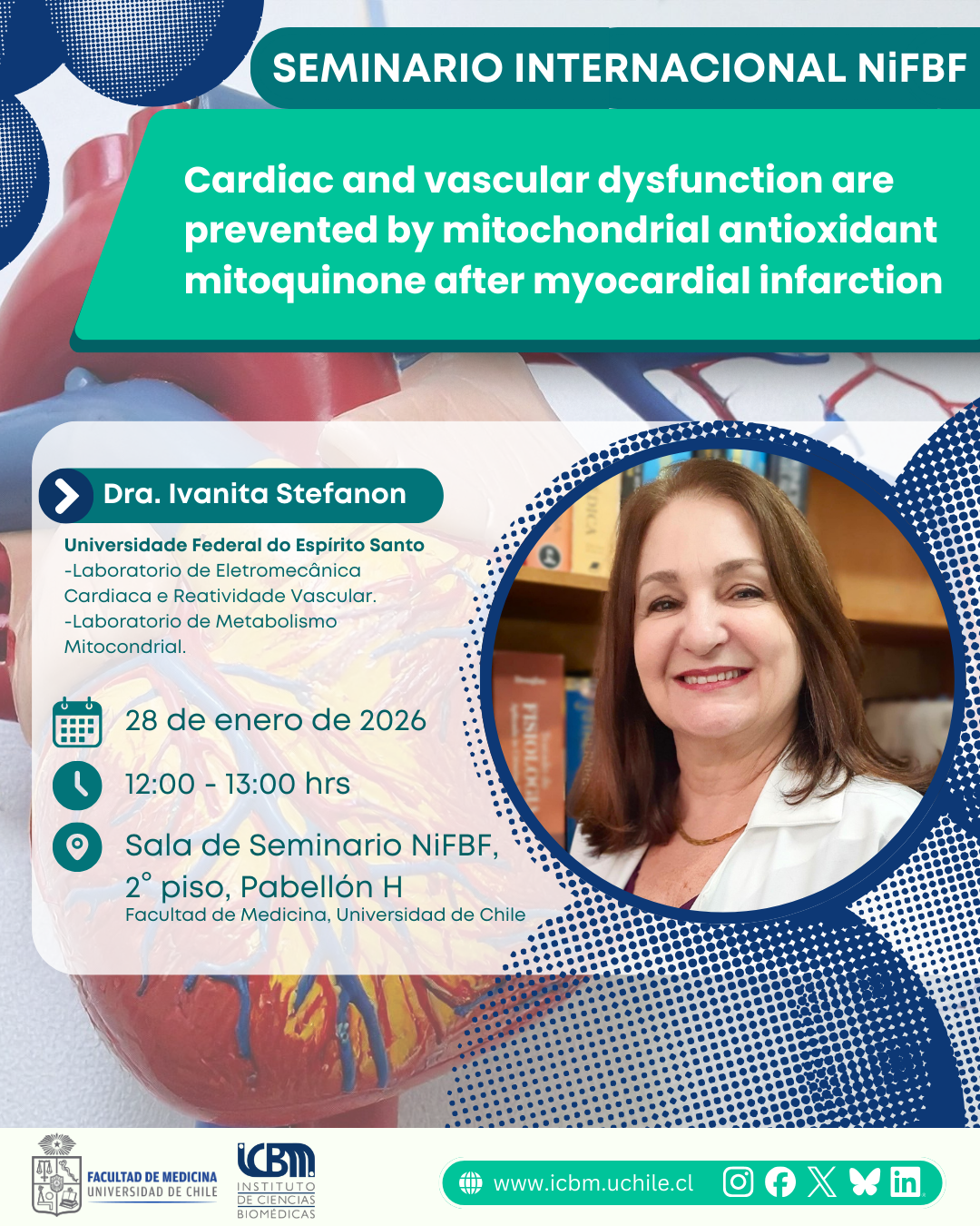 El Núcleo Interdisciplinario de Fisiología y Biofísica (NiFBF) invita a la comunidad académica al Seminario Internacional NiFBF, que contará con la presentación de la Dra. Ivanita Stefanon, académica de la Universidade Federal do Espírito Santo (Brasil).