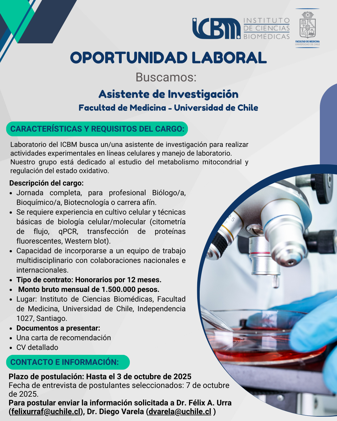 Para postular enviar la información solicitada a Dr. Félix A. Urra (felixurraf@uchile.cl), Dr. Diego Varela (dvarela@uchile.cl)